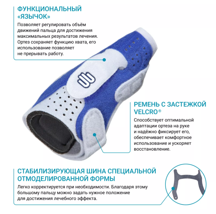 • Застежки Velcro позволяют легко надевать и снимать ортез, а также адаптировать его под индивидуальные особенности большого пальца;